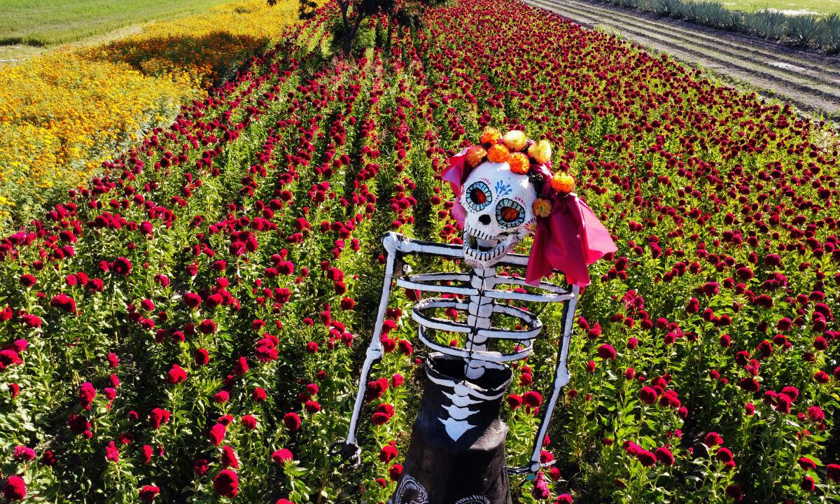 Una decena de calaveras catrinas monumentales adornan los sembradíos de flor de muerto en Mitla, Oaxaca, un municipio zapoteco que en lengua náhuatl se llama “Mictlán”, que significa “lugar de los muertos”.