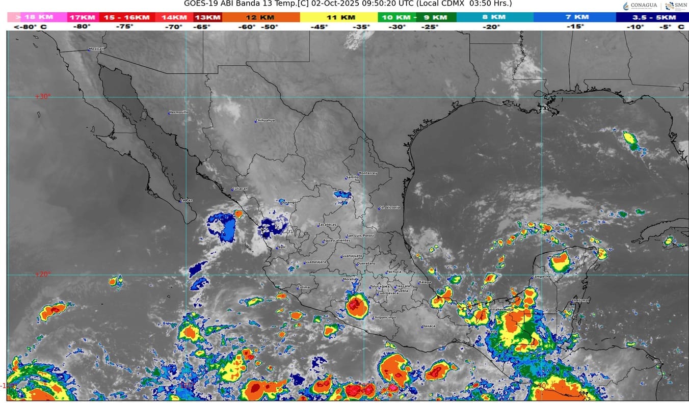 Canales de baja presión sobre el interior del país, inestabilidad atmosférica y el ingreso de aire húmedo del océano Pacífico y golfo de México, originarán lluvias puntuales fuertes en Puebla, Estado de México, Hidalgo y San Luis Potosí; intervalos de chubascos en Morelos, Tlaxcala, Ciudad de México, Querétaro, Tamaulipas y Durango; así como lluvias aisladas en zonas de Guanajuato, Zacatecas, Nuevo León, Chihuahua y Sonora.